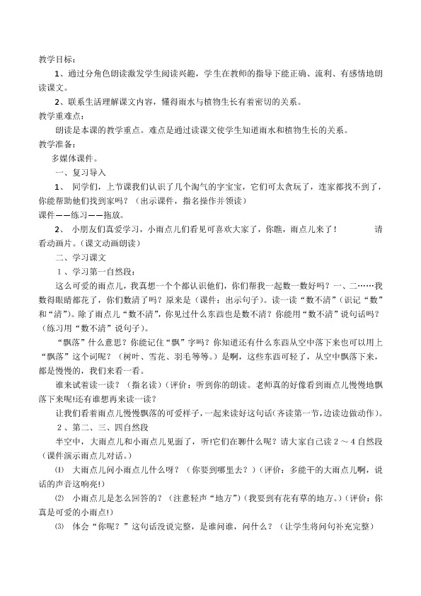 朗读是本课的教学重点。难点是通过读课文使学生知道雨水和植物生长的关系。