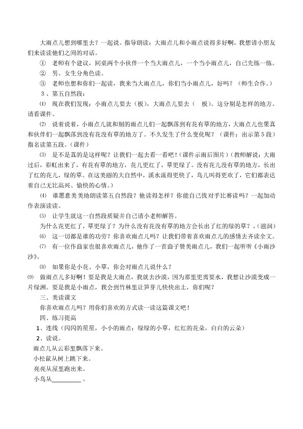 ⑴ 大雨点儿问小雨点儿什么呀?(你要到哪里去?)(评价:多能干的大雨点儿啊,说话的声音这响亮!)