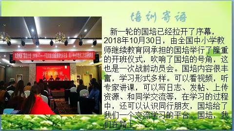 新一轮的国培已经拉开了序幕,2018年10月30日,由全国中小学教师继续教育网承担的国培举行了隆重的开班仪式,吹响了国培的号角,这也是一次战前动员会。国培内容很丰富,学习形式多样。可以看视频,听专家讲课,可以写日志、发帖、上传资源、和同学交流等,在学习的过程中,还可以认识同行朋友,国培给了我们一个交流学习的平台。国培,我们在路上XXXXXXXXXX