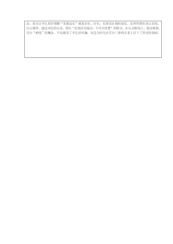 1.在学习活动中构建知识。 数学教学是数学活动的教学,数学活动是一种激发学生创新思维的活动,是学生动手动脑的活动,数学知识的获得是数学活动的结果。数学活动不仅是为了激发学生学习数学的兴趣,更重要的是学生需要在自主的数学活动中理解数学,体验数学。观察能力和逻辑思维能力得到发展。 本节课的教学活动中,我让学生通过观察,引出“用直尺把两点连接起来”可得到一条线断的描述性定义,并告诉学生什么是端点,指出线段有两个端点,指出怎样表示一条线段,(出示课件)。在认识直线上,用图示与语言描述相结合的方法,引出“把线段两端无限延长”的直线概念,重点让学生初步理解“无限延长”就是好长,好长,长得无止境的意思。怎样用图形表示直线,出示课件。通过对比的方法,得出“直线没有端点,不可以度量”的特点。在认识射线上,通过观察,引出“射线”的概念。不仅激发了学生的兴趣,而且为学生在区分三者的关系上打下了坚实的基础。