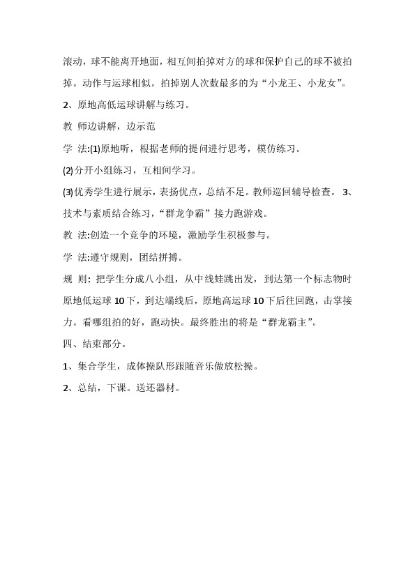 教 法:提问题,学生自主学习与游戏相结合。导入课题。教师参与并监督。游戏方法、规则:每人一球,在一个篮球场范围内,用手拍球滚动,球不能离开地面,相互间拍掉对方的球和保护自己的球不被拍掉。动作与运球相似。拍掉别人次数最多的为“小龙王、小龙女”。