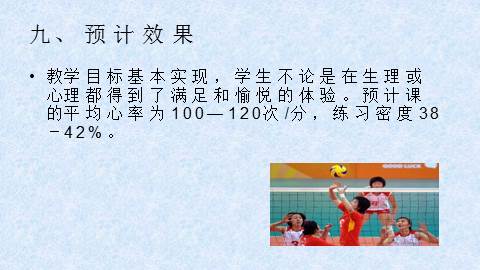 教学目标基本实现,学生不论是在生理或心理都得到了满足和愉悦的体验。预计课的平均心率为100—120次/分,练习密度38-42%。