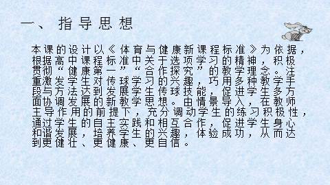 本课的设计以《体育与健康新课程标准》为依据,根据高中课程标准中关于选项学习的精神,积极贯彻“健康第一”“合作探究”的教学理念。注重激发学生对传球学习的兴趣,巧用多种教学手段与方法达到发展学生传球技能,促进学生多方面协调发展的新教学思想。由情景导入,在教师主导作用的前提下,充分调动学生的练习积极性,通过学生的自主实践和相互合作,促进学生身心和谐发展,培养学生的兴趣,体验成功,从而达到更健壮、更健康、更自信。