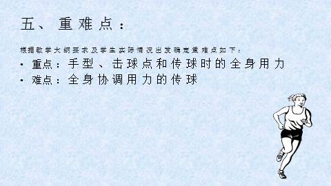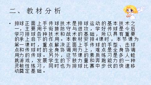 排球正面上手传球技术是排球运动的基本技术之一,主要用于衔接防守与进攻,学好传球是今后学习排球各种技术和战术的基础,所以具有重要的承上启下的作用。本教材安排4课时,本节课为第一课时,重点解决正面上手传球的手型、击球点和传球时的全身协调用力上,难点是全身协调用力的传球。另外,这节课的素质练习是多人蛙跳游戏,发展学生的下肢力量和奔跑能力的一种灵敏性练习,同时也为排球比赛中步伐的快速移动奠定基础。
