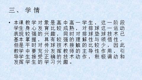 本课教学对象是高中高一学生,这一阶段学生身心发育比较成熟,对排球这一运动表现较强的兴趣,同时对排球垫球技术已基本掌握,具有较强的理解性与领悟性,但是平时对传球技术接触的比较少,因此教学中要充分发挥教师的主导性作用,引导学生接受正确的技术动作,积极调动和发挥学生的学习兴趣。
