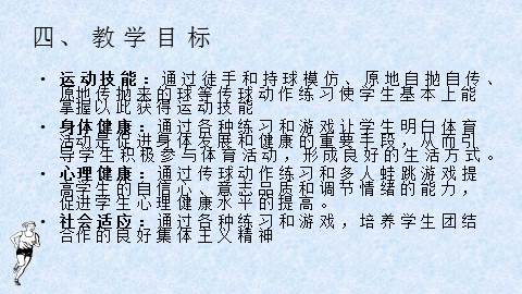 心理健康:通过传球动作练习和多人蛙跳游戏提高学生的自信心、意志品质和调节情绪的能力,促进学生心理健康水平的提高。