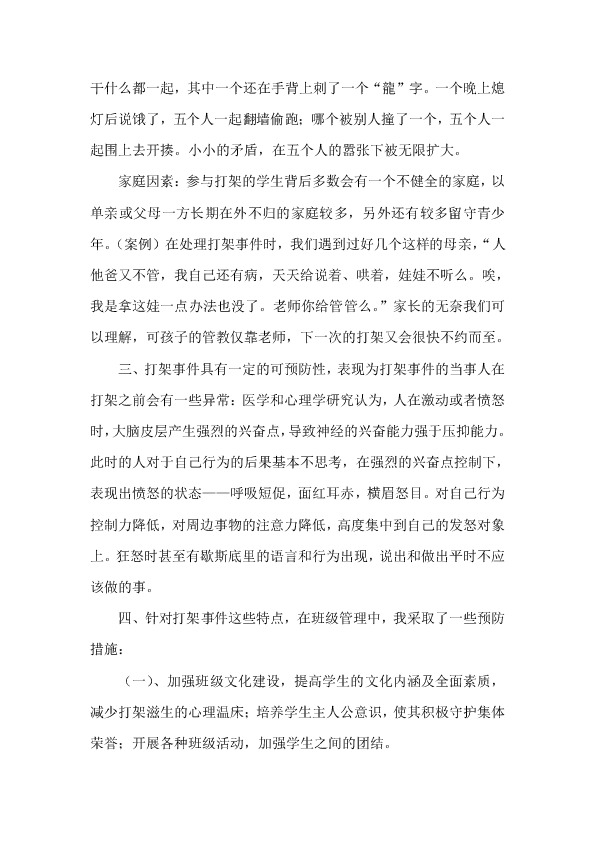 一、打架事件会有如下共同点:打架事件主角多为男生,近些年女生打架事件有所上升。打架事件发生时间多为课间活动、两操结束后、饭前饭后、睡前醒后这些班主任管理漏洞的时间;且每学期初、学期末,尤其是毕业季学生打架现象更为严重,后果更为恶劣。打架事件突发性居多,且多为一些小事,预谋性较少。打架后果多为一般性伤害,危及生命的事件几乎为零。打架事件有单挑性质,也有更为恶劣的群架性质。
