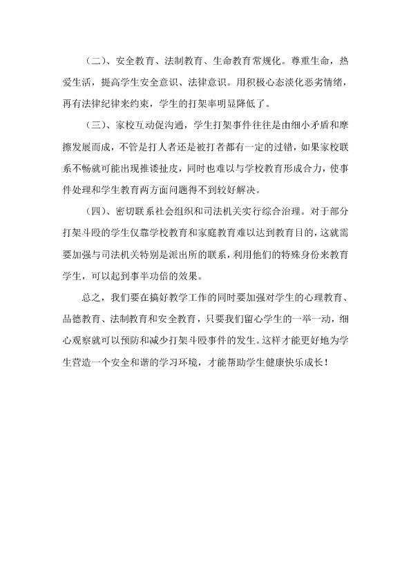 总之,我们要在搞好教学工作的同时要加强对学生的心理教育、品德教育、法制教育和安全教育,只要我们留心学生的一举一动,细心观察就可以预防和减少打架斗殴事件的发生。这样才能更好地为学生营造一个安全和谐的学习环境,才能帮助学生健康快乐成长!