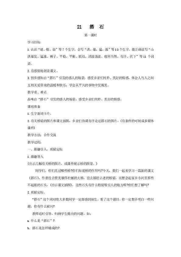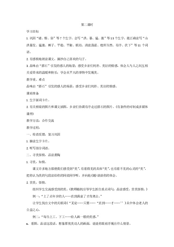 2.有关桥梁的图片和课文插图,乡亲们协调有序走过搭石的图片。(有条件的可制成多媒体课件)