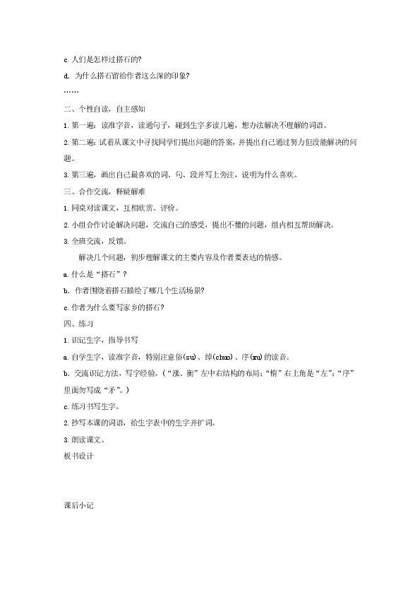 3.初步感知由“搭石”引发的感人的场景;感受乡亲们纯朴、美好的情感,体会人与人之间互相关爱带来的温暖和快乐;学会从平凡的事物中发现美。