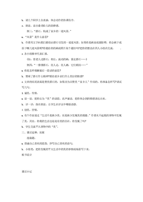 b.作者用文字向我们描绘由搭石引发的一道道风景,如果你是画家或摄影师,你会画下或拍下哪几道风景呢?你能给你的画或照片取个题目吗?把你的想法在四人小组内交流。 .