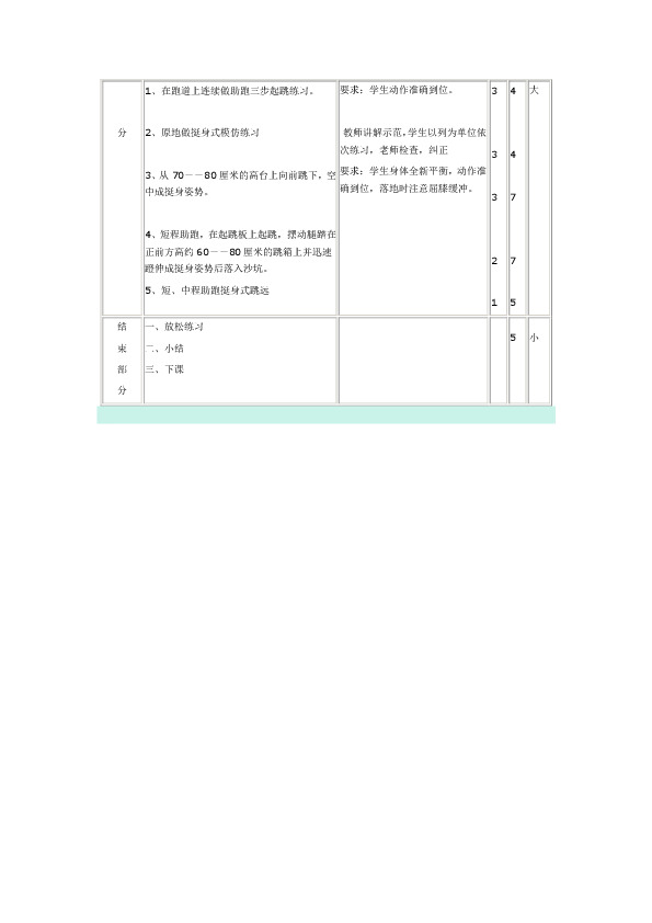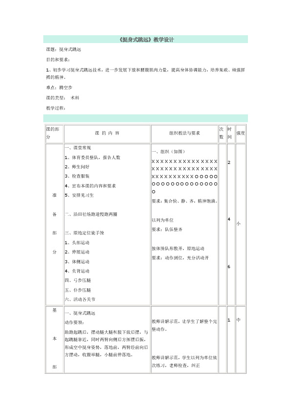 1、初步学习挺身式跳远技术,进一步发展下肢和腰腹肌肉力量,提高身体协调能力,培养果敢、顽强拼搏的精神。